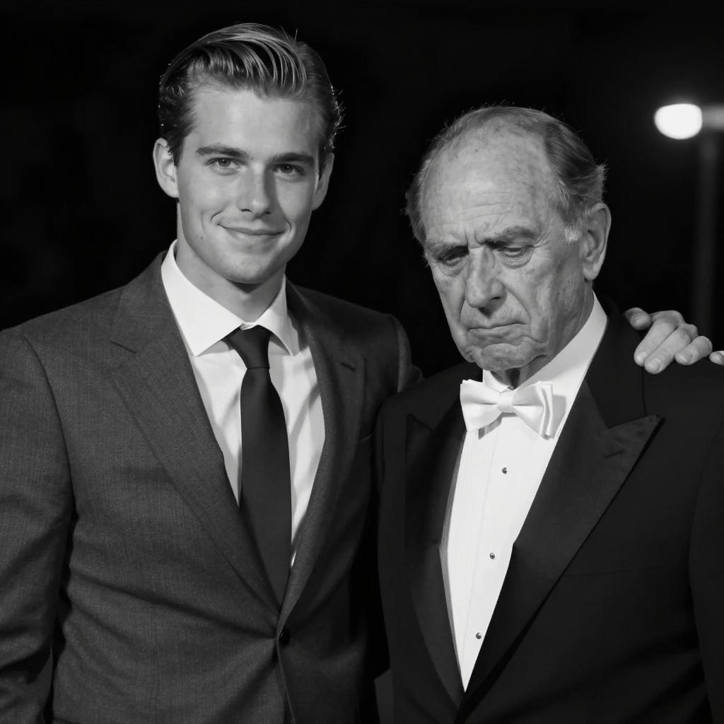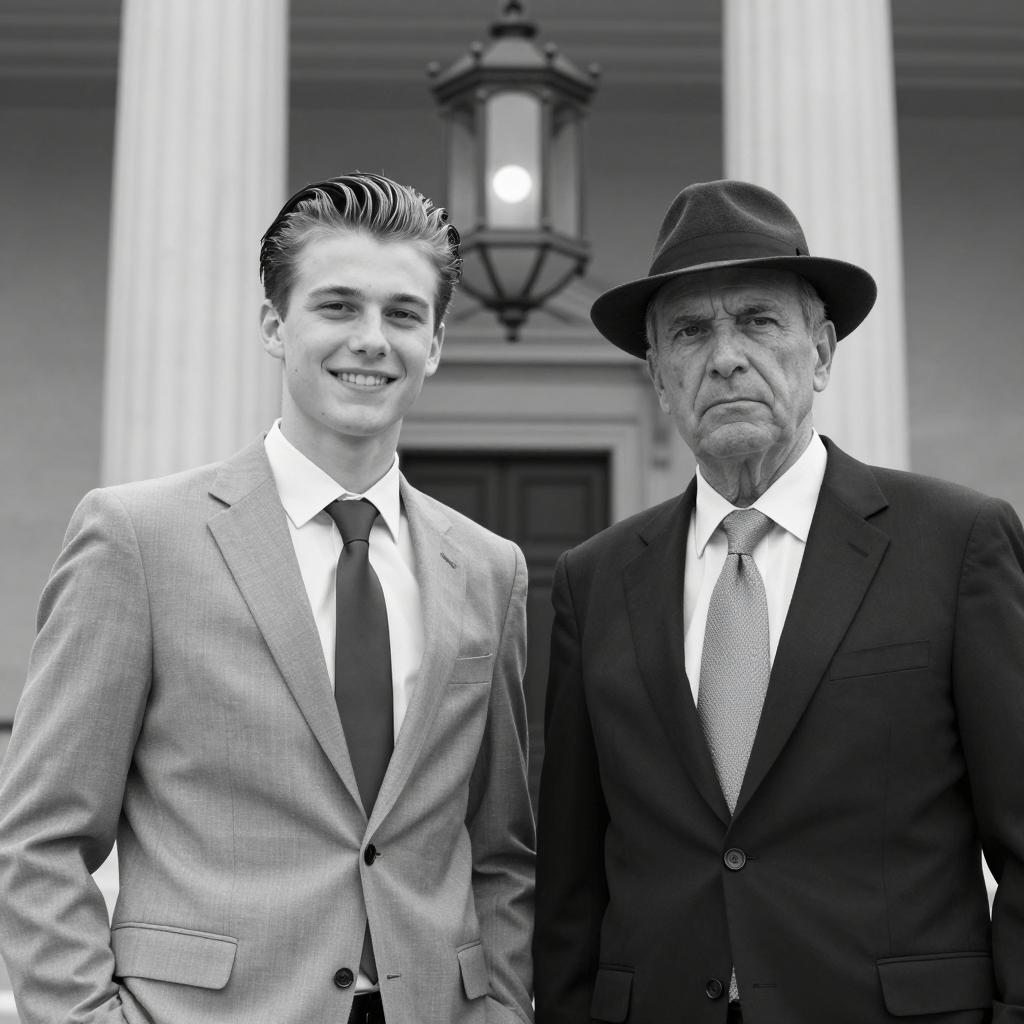 Black and white photo of two men standing side by side in front of a building with tall columns. The young man on the left wears a light suit with a dark tie, has slicked-back hair, and is smiling. The older man on the right wears a dark suit with a light tie and a fedora, showing a serious expression. An ornamental lantern hangs above the entrance behind them.