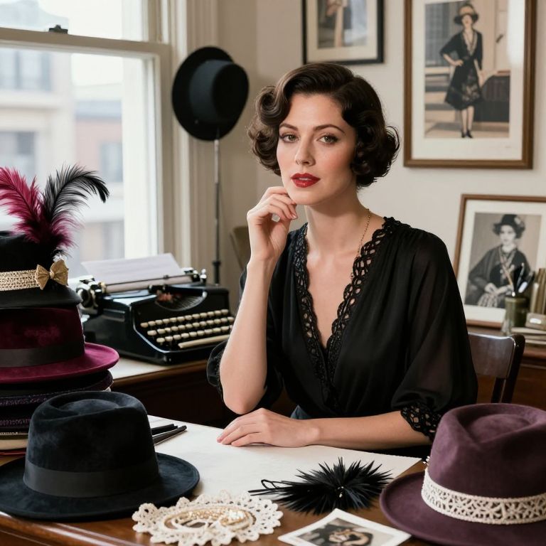 A beautifully composed image of a poised 1920s milliner with a poised jawline and glowing complexion, standing in front of a detailed hat-making station with stacked velvet hats, silk feathers, and lace trimmings, behind her a vintage typewriter and framed fashion photos from the 1920s, with soft natural light streaming through a window showing a cityscape in the background.