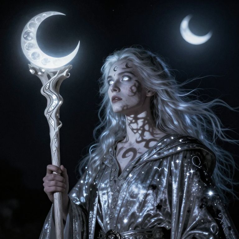 Digital artwork of a silver-haired, glowing-eyed figure in a starry, metallic robe holding a crescent moon staff under a dark, moonlit sky