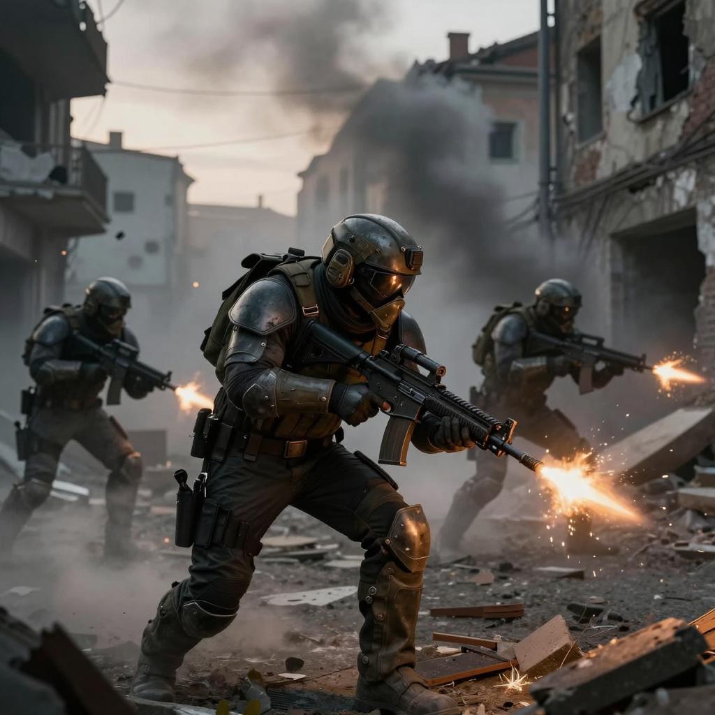 Hyper-realistic image of three soldiers wearing dark tactical armor and helmets with visors, engaging in a covert sabotage mission on a war-torn European street at dusk. The soldiers are armed with rifles, firing amid shattered buildings and smoke plumes. The scene features cinematic lighting, detailed armor and weaponry, sparks, and muzzle flashes illuminating the smoky urban battlefield environment.