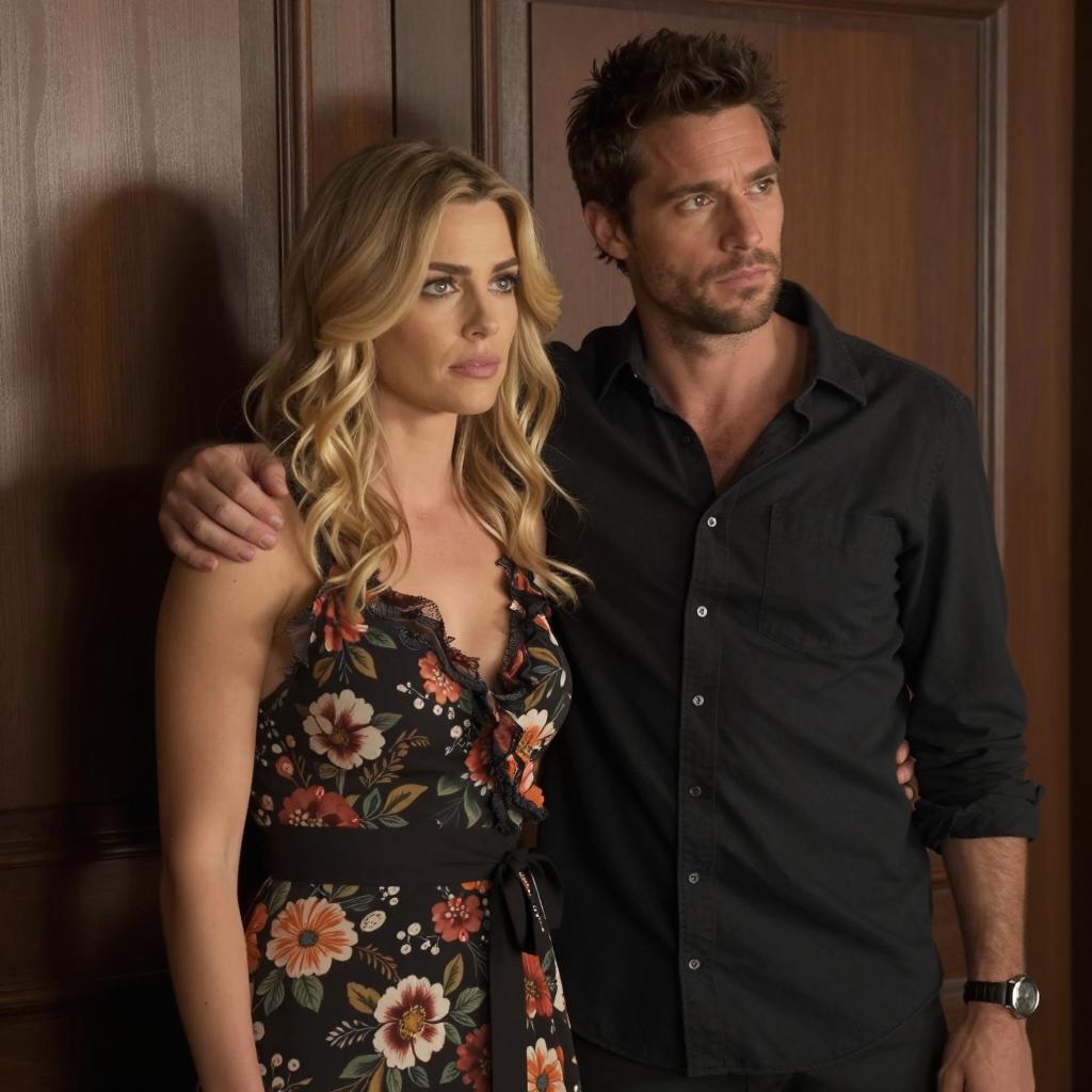 Four people in a dimly lit room. Man on left, muscular, tan shirt, dark hair, hands in pockets. Middle man, dark hair, leather jacket, open shirt, polka dot pajama pants. Blonde woman in center, grey patterned shirt, red tie, hands in pockets. Woman on right, light brown hair, pink shirt, striped pants, hand to mouth. Lamp in foreground, curtains in background.