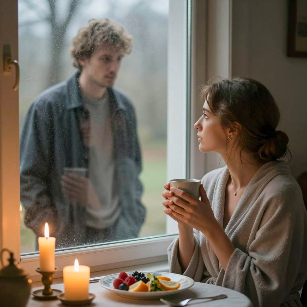 A young man and woman sit facing each other at a small round table by a window, each holding a glass of red wine. The man, with curly hair, wears a white shirt with black suspenders and holds a cigarette. The woman wears a sleeveless black dress and lightly touches the cigarette with her hand. Warm natural light filters in, creating an intimate and focused atmosphere. A green wine bottle is on the table between them. The setting appears to be indoors with a blurred exterior building visible through the window.