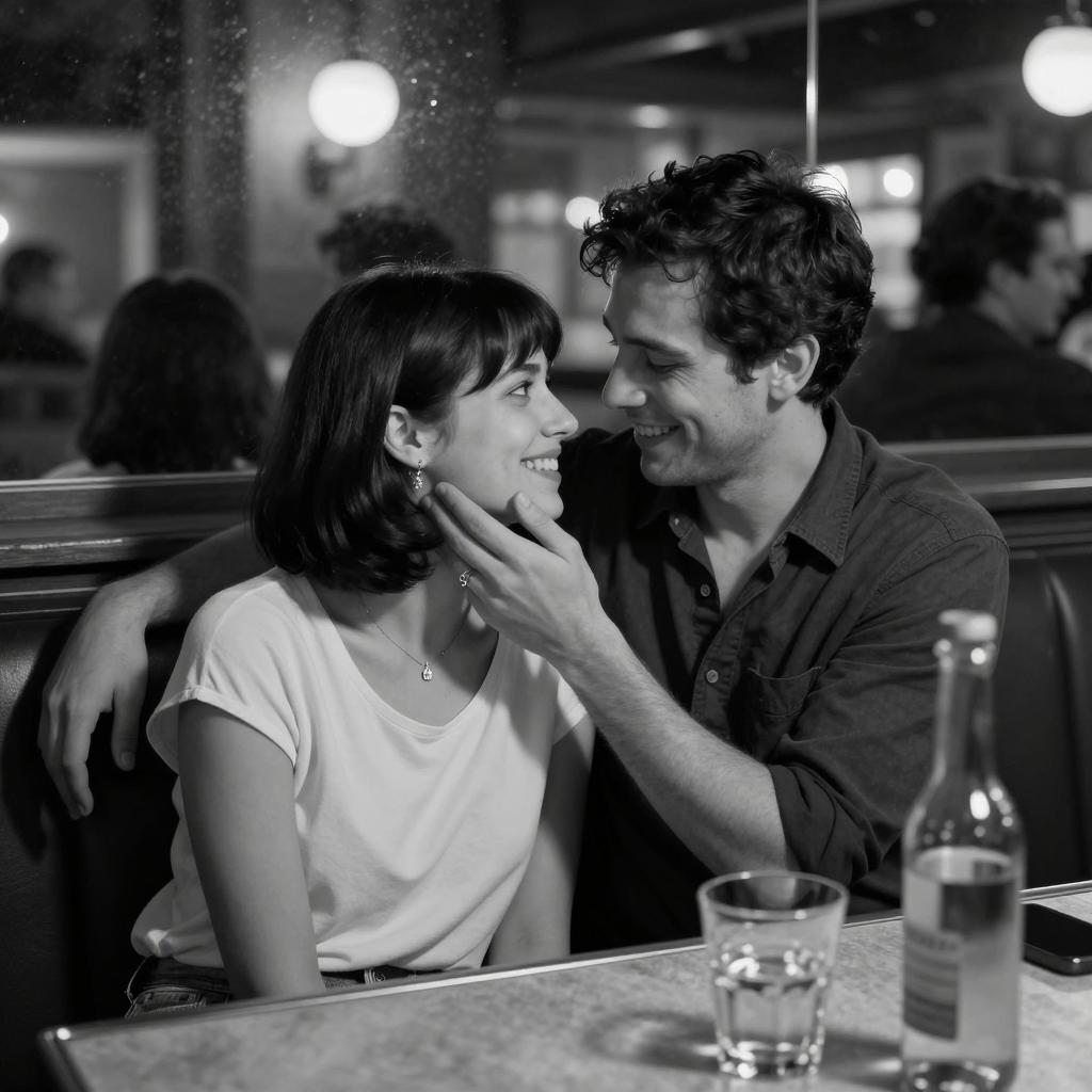 Illustration of a man and woman sitting at a table, facing each other. Man in white shirt and black suspenders, woman in black sleeveless dress. Both holding glasses of red wine. Man's left hand holds a cigarette, which the woman's right hand lightly touches. Light comes through a window behind them. Building exterior visible through window. Man looks at woman, woman looks at man. Table has two wine glasses and a green bottle. Intimate, focused expressions.