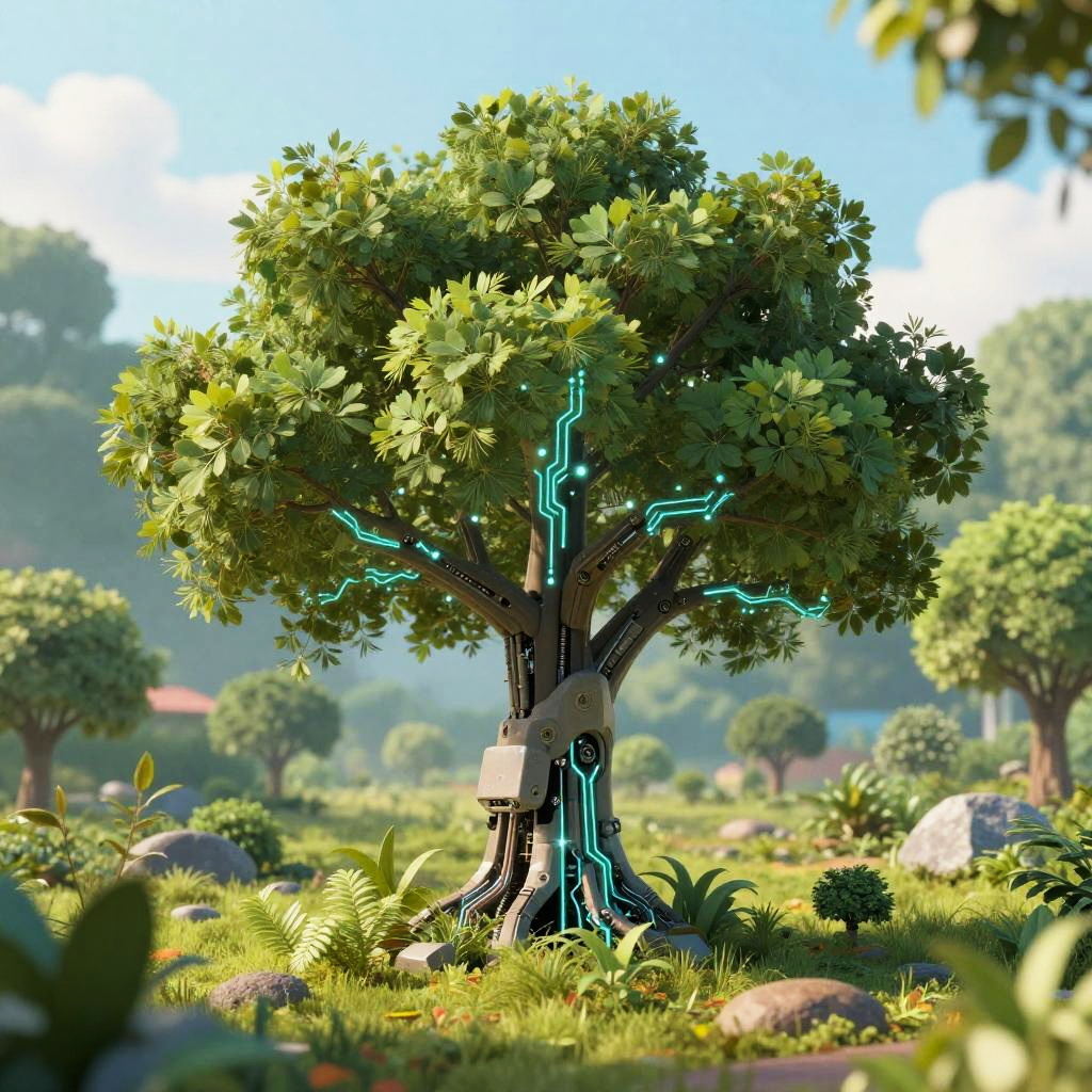 Ia pictures illustrating the fusion of nature and AI, such as a robotic tree with glowing circuits among real foliage, emphasizing harmony between technology and the environment with soft lighting and surreal details.