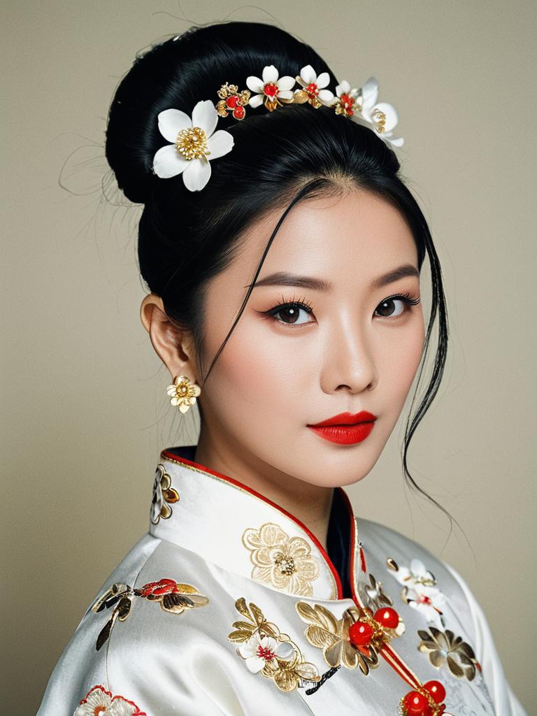 Asian wedding clothes, 1girl, solo, black hair, earrings, jewelry, realistic, looking at viewer, chinese clothes, asian, red lips, flower, hair ornament, upper body, lipstick, makeup, hair bun