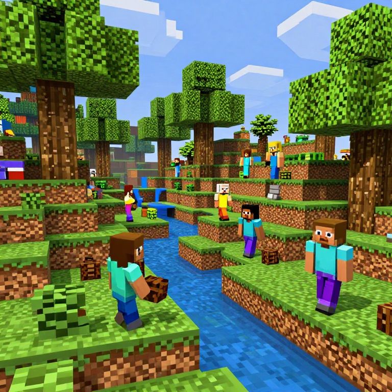 Minecraft stock images featuring blocky pixel art landscapes with vibrant green forests, pixelated rivers, and classic Minecraft characters mining and crafting under a bright blue sky, high resolution with detailed textures and dynamic lighting.
