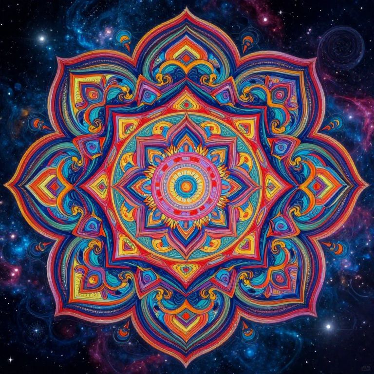 A vibrant, intricately detailed mandala with a central circular pattern, surrounded by swirling, colorful elements, evoking a sense of connection between the individual and the universe.