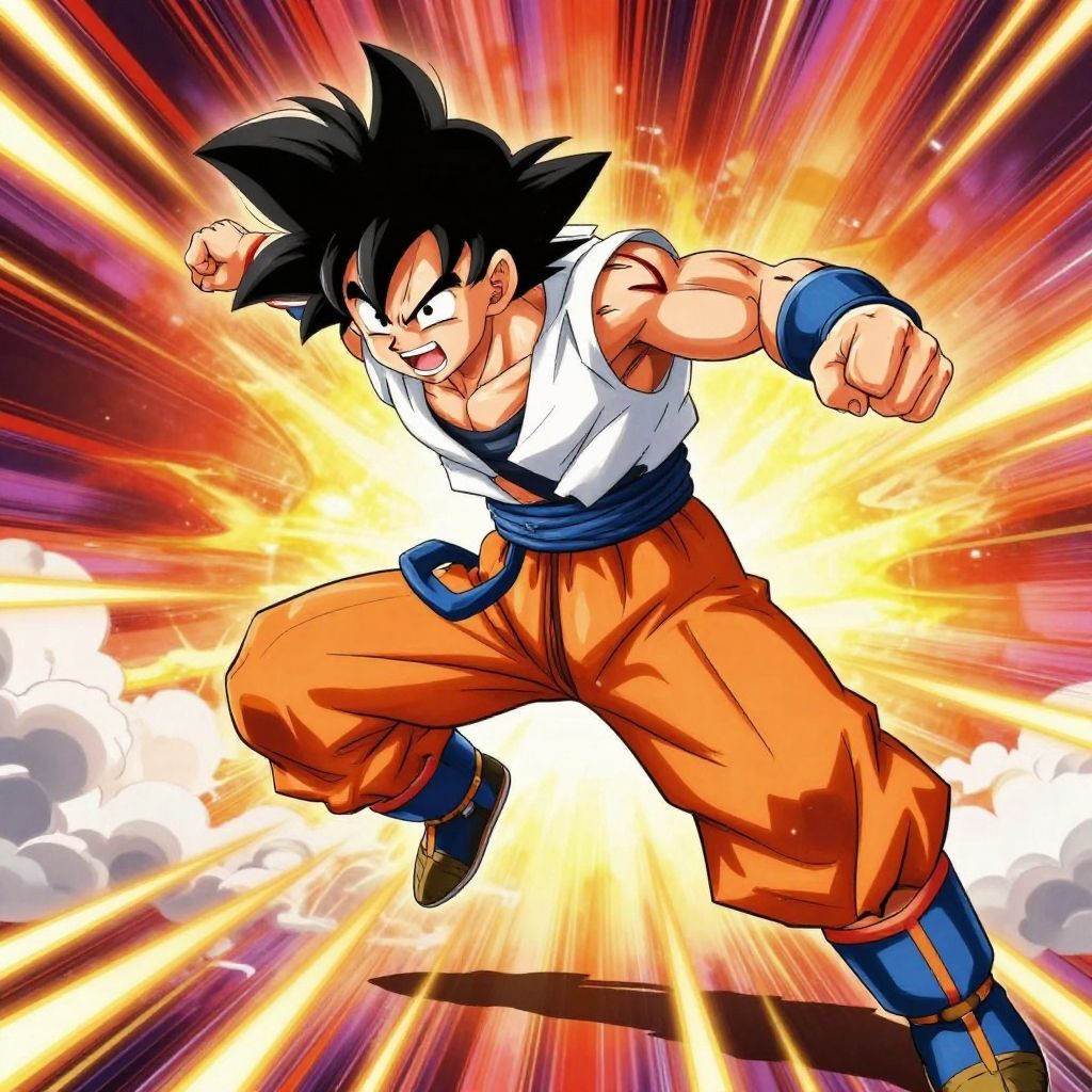 Digital anime-style drawing of Son Goku from Dragon Ball Z. He is mid-action, leaping with a fierce expression, fists clenched. He wears a white sleeveless shirt, orange martial arts pants with a blue belt, and blue wristbands and shoes. His black spiky hair is dynamic and energetic. The background is a burst of radiant yellow, orange, and red light rays, with white clouds below. Goku's muscular physique is highlighted, with pronounced biceps and defined abs. The overall style is vibrant and dynamic, capturing the intensity and energy of the character in combat mode.