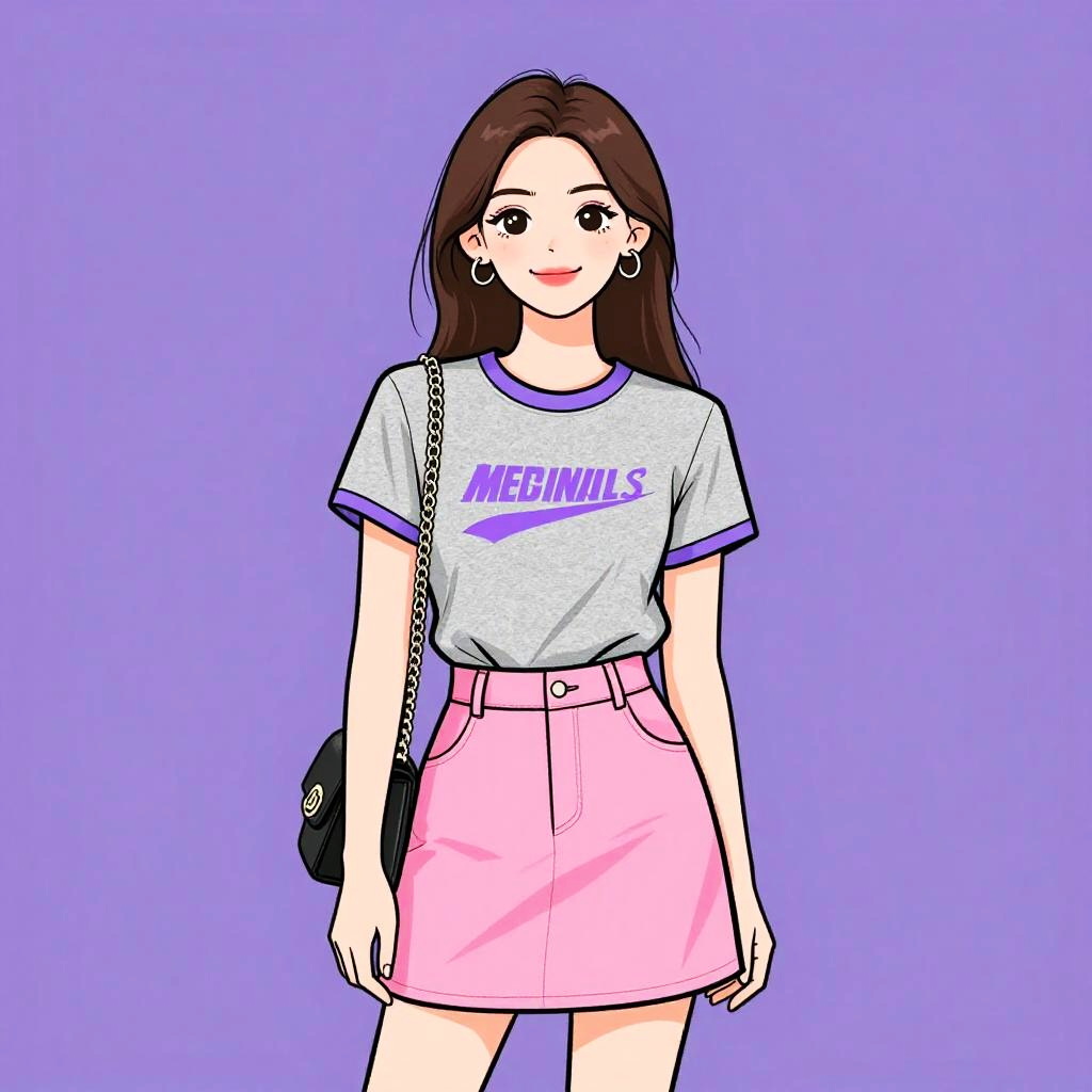 Woman with pretty face and pretty hair. smiling Woman, casual, ringer t-shirt in grayscale with text graphic, short sleeves, contrast ribbing at neckline and sleeve hems, vibrant pink skater skirt, mini length, high-waisted, black shoulder bag with chain strap. --sref 1467