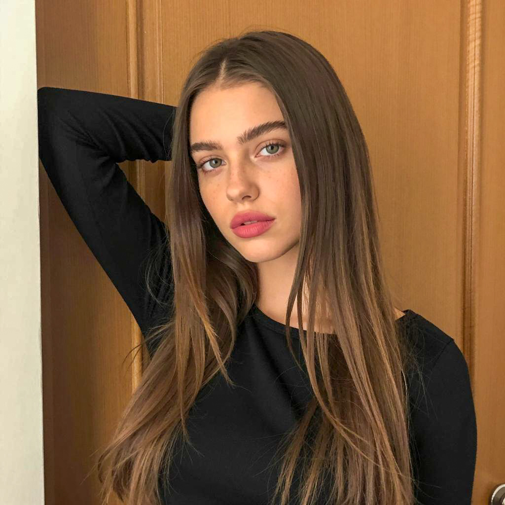 Young woman with long straight brown hair, green eyes, and pink eyeshadow. Wearing black ribbed button-up shirt with gold buttons. Sitting in car, left hand resting on chin. Neutral facial expression. Car seat and window in background. Silver nail polish on fingers. Daylight outside.