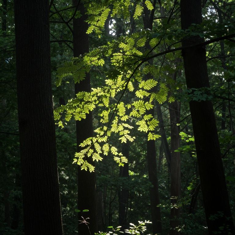 Photograph of a dense forest with tall, dark brown tree trunks. Bright, sunlit green leaves of a single branch in the foreground stand out against the shadowy background. The leaves are small with prominent veins, creating a delicate, luminous effect. The forest floor is barely visible, covered in dark green underbrush. Light filters through the canopy, highlighting the leaves while leaving the background in deep shadow, creating a contrast between light and dark. The image captures the serene, mysterious atmosphere of a woodland setting.