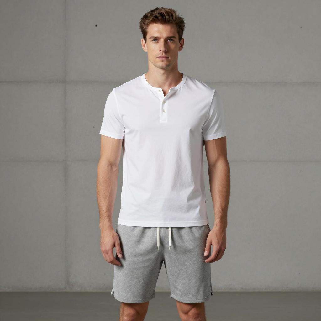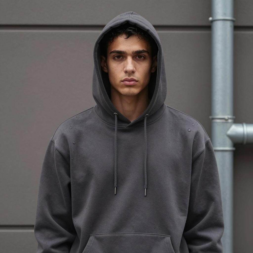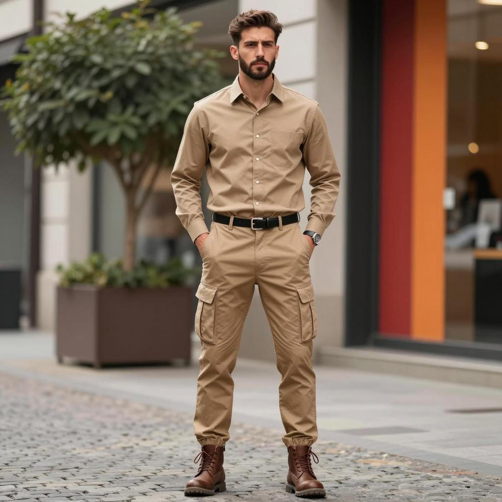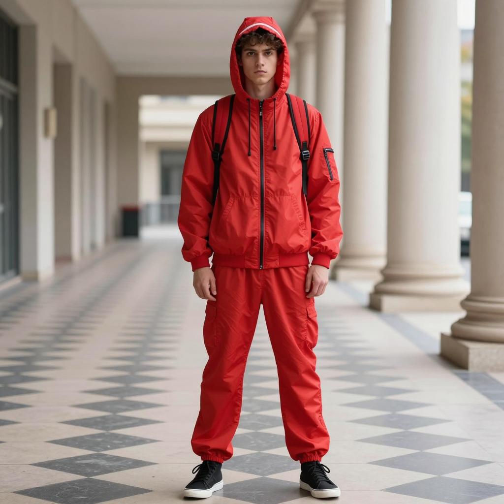 White hero costume, photograph, full-body shot, man wearing white, full-length, hooded, zip-up jumpsuit, white hooded cap, standing in outdoor urban alleyway, sunlight from behind, beige buildings in background, sharp focus on man, slightly blurred background, bright sunlight, serious expression, muscular build, medium brown skin, light shadows, daytime, realistic style