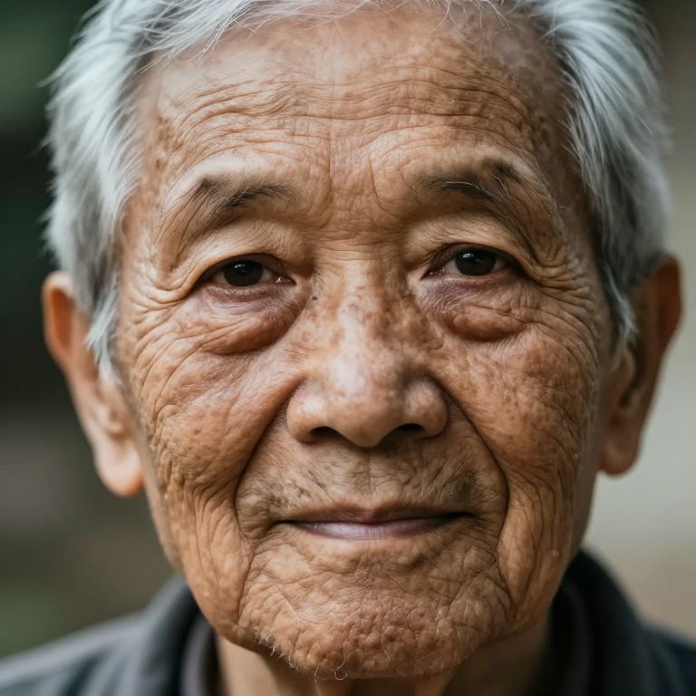 Photograph of an elderly Asian man with deeply wrinkled, tanned skin and short, white-gray hair. His expression is calm and slightly smiling, with deep-set brown eyes and slightly sagging cheeks. He wears a dark gray shirt, and the background is softly blurred, suggesting an outdoor setting with natural light. The texture of his skin is prominently detailed, highlighting the lines and folds of age. The image is close-up, focusing on his face, and has a high level of detail and contrast.
