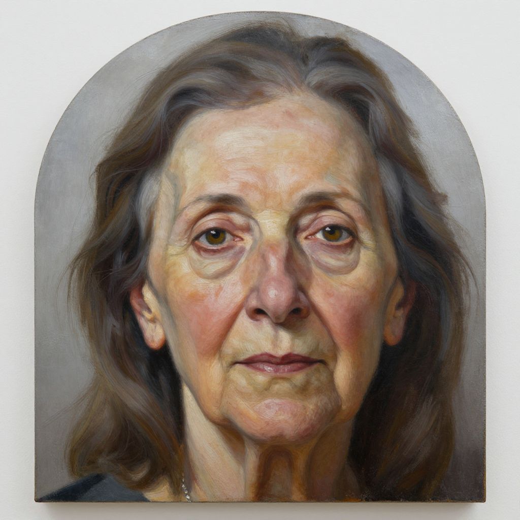 Realistic oil painting of an older woman with short, wavy gray hair, fair skin, brown eyes, and subtle smile against a plain gray background