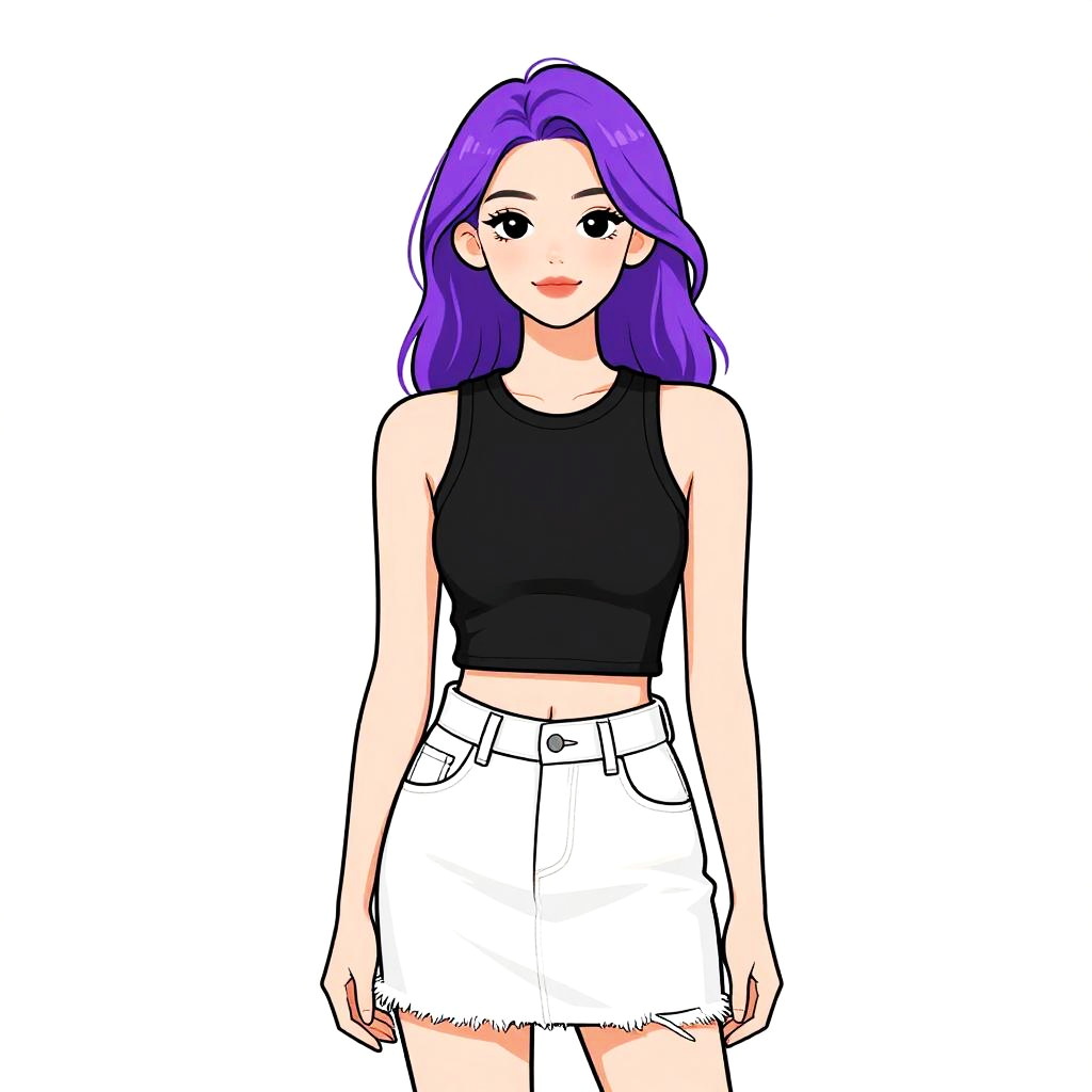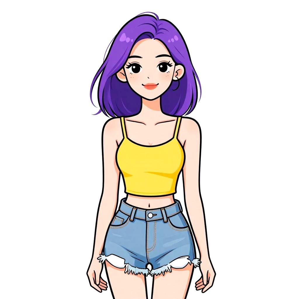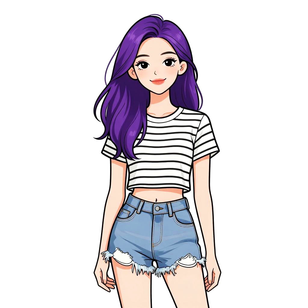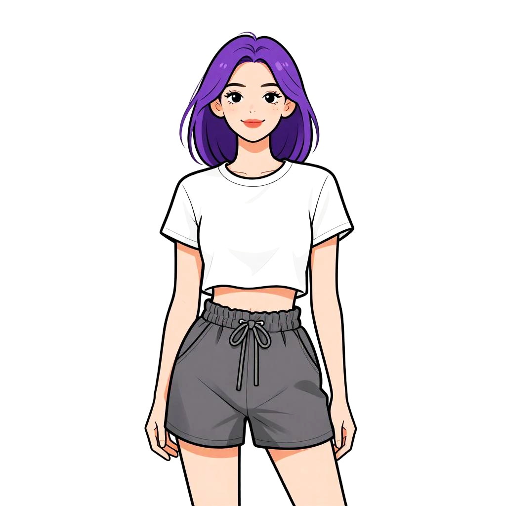 Woman with pretty face and pretty hair. Woman, casual streetwear, coral red cropped t-shirt, frayed denim shorts, mid-thigh length, white sneakers, white baseball cap with logo, relaxed posture, plain white studio background. --sref 1467