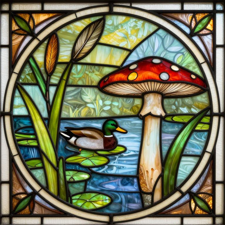 Beautifully detailed victorian art nouveau stained glass mushroom river reeds duckweeds close up abstract mallard feathers rubber leaves foliage, circle, curved arched borders kilian eng harry clarke