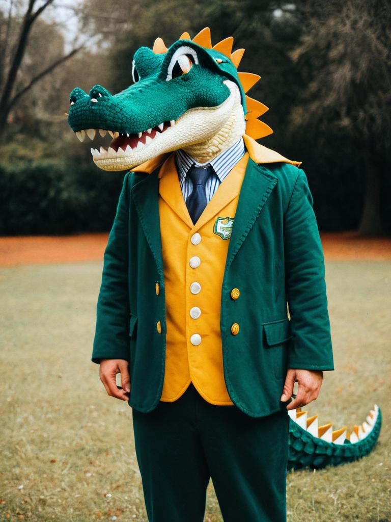 Man cosplay. Wearing Montgomery Gator costume. Realistic photo. Dressed as Montgomery Gator --sref 1392