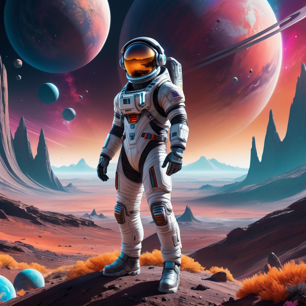A male astronaut, dressed in a sleek futuristic space suit, stands in a breathtaking distant planet landscape. Full-body depiction, showcasing his vibrant outfit and a high-tech communication headset. Hyper-detailed facial features and precisely crafted hands reveal his adventurous spirit, while the scene is brought to life through a digital art style blending realism and fantasy.