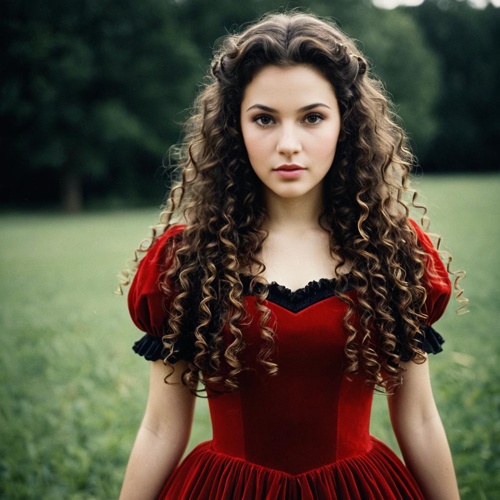 Portrait of a young woman with long, curly brown hair and freckles wearing a red dress, standing indoors against a patterned wallpaper background. She has a calm expression and is looking directly at the camera. The room features a dark wooden door, a vintage sideboard, and framed artwork including a portrait of a woman in a red dress.