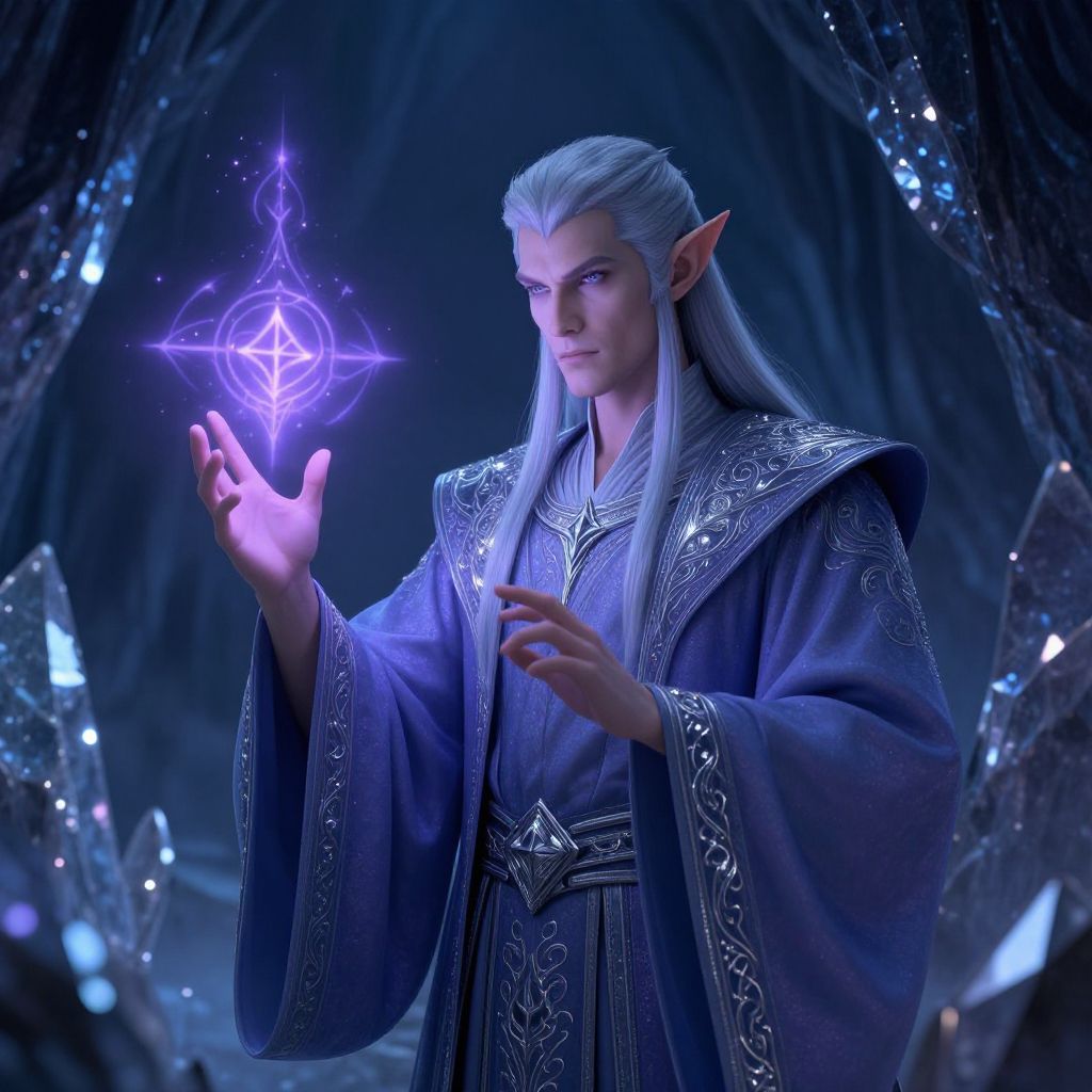 Eladrin 5e royal figure seated on ethereal throne, surrounded by magical flora, seasonal aura shifting from spring to winter, intricate fantasy costume, regal and mysterious ambiance