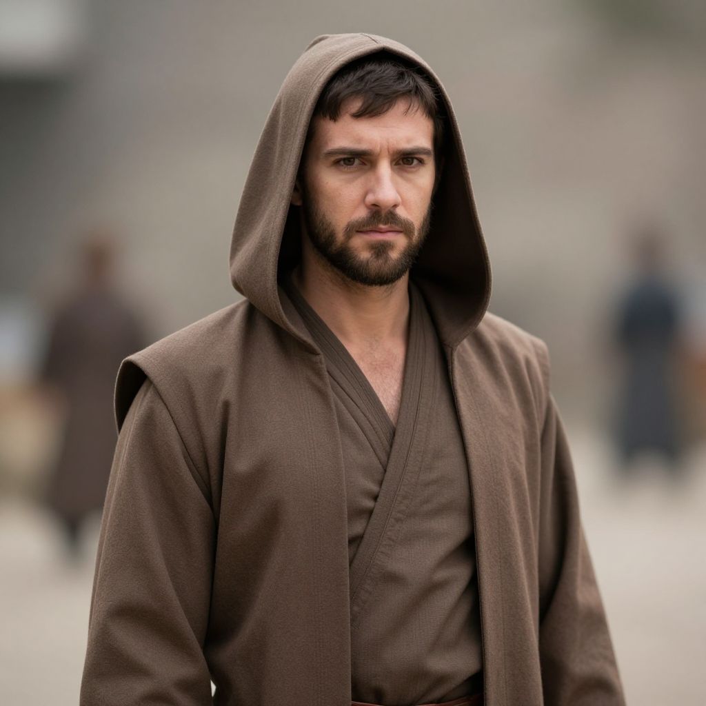 Obi wan adult costume, 1boy, male focus, solo, looking at viewer, facial hair, outdoors, hood, standing, blurry, short hair, blurry background