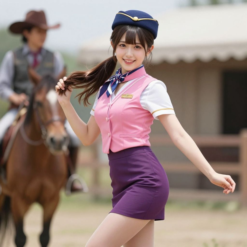 Brown ponytail with blunt bangs, (ultra high res), (photorealistic:1.4), (high quality), (hyper realistic), detailed flying attendant uniforms, airplane captain hat, high cut bare legs skirt, tights up, 1 girl, smile, dynamic, cute Japanese girl, hourglass body, thin waist, outdoors, large beautiful eyes, pink skin, shiny hair, beautiful legs, detailed background, bokeh, cowboy shot