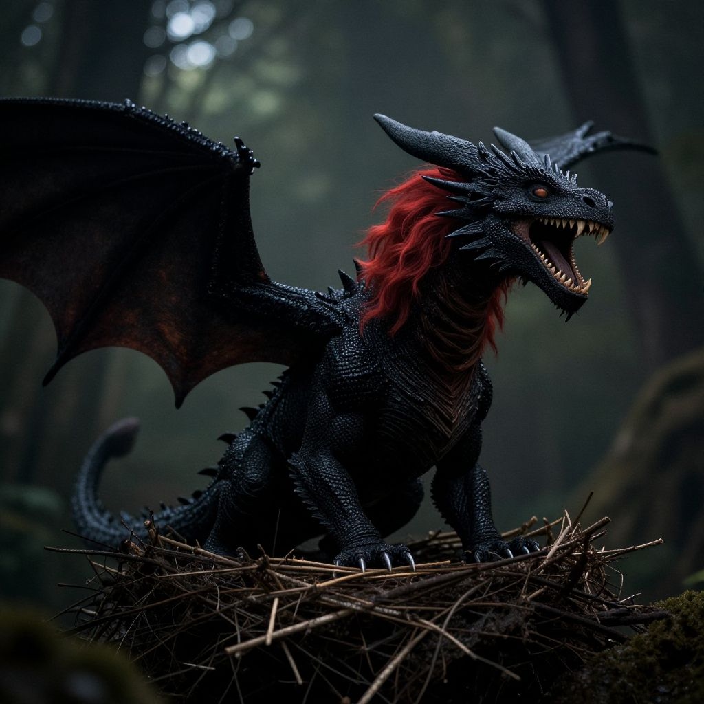 RAW 8k image, realistic, a black dragon with medium back red hair, big pointy teeth in a dark forest on top of its nest, adult, photography, VERY detailed, intricate details, film grain, accent lighting, soft volumetric light, cinemagraph, night, 50mm, emotional, harmonious, vignette, highly detailed, high budget, bokeh, cinemascope, moody, epic, gorgeous, grainy.