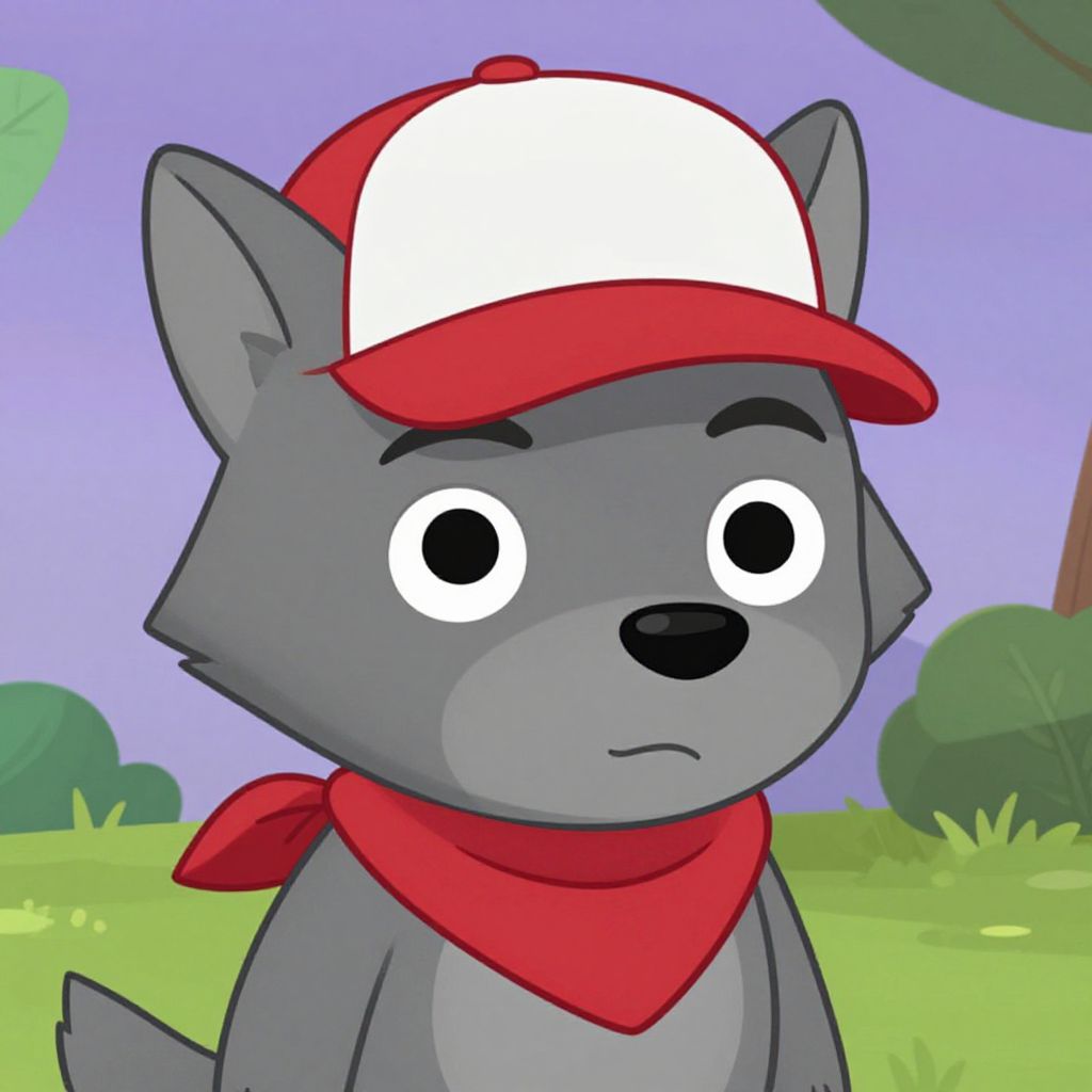 Cartoon gray wolf with large white and red cap, red bandana, and serious expression in colorful, sunny outdoor background.