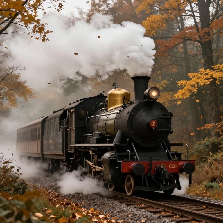 Sxd vintage steam train chugging through a misty forest in autumn, golden leaves falling around, detailed steam clouds rising upwards, warm earthy tones mixed with cool morning shadows, nostalgic and atmospheric setting evoking a sense of adventure and travel