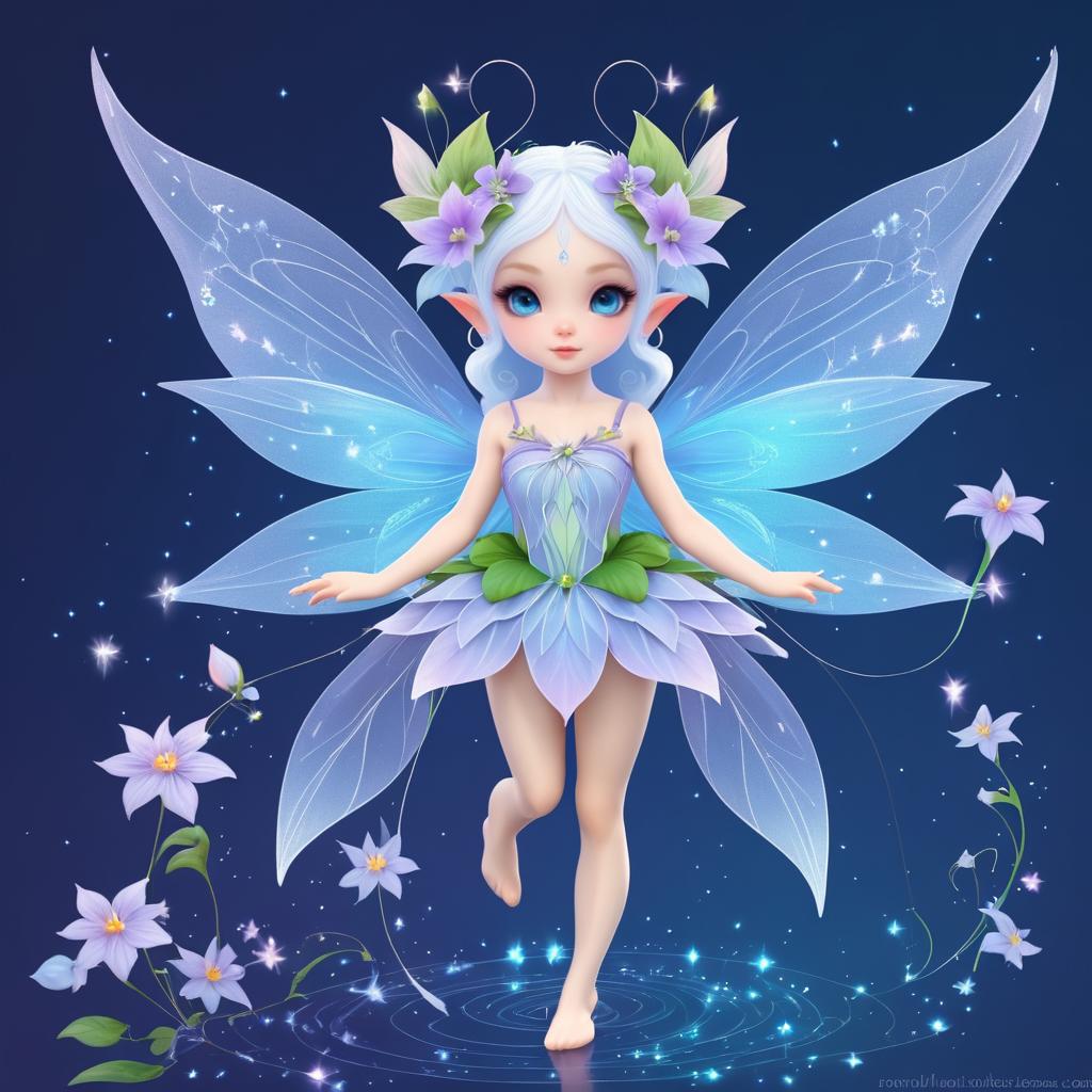A petite fairy with translucent blue wings and lavender wavy hair adorned with flowers, wearing a dress made of delicate flower petals in shades of blue and purple, standing barefoot on a reflective water surface surrounded by blooming flowers and magical glowing lights.