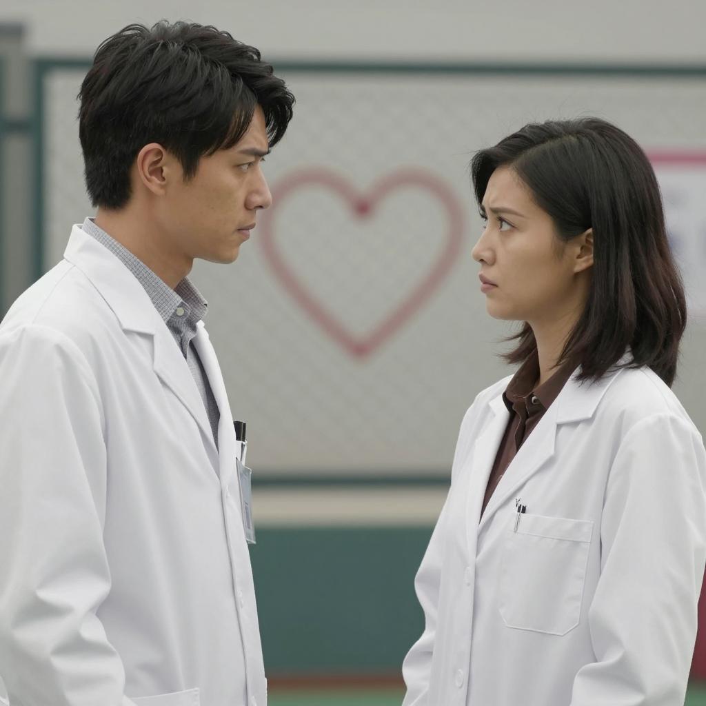 Three men in an office. First man, black, glasses, white lab coat, writing in a notebook. Middle man, white, dark hair, white lab coat, red tie, holding folders. Last man, bald, white lab coat, brown tie, holding papers. Gray walls, fluorescent lights, desk with paperwork. Middle man's expression is intense. First and last men have neutral expressions. Office setting.