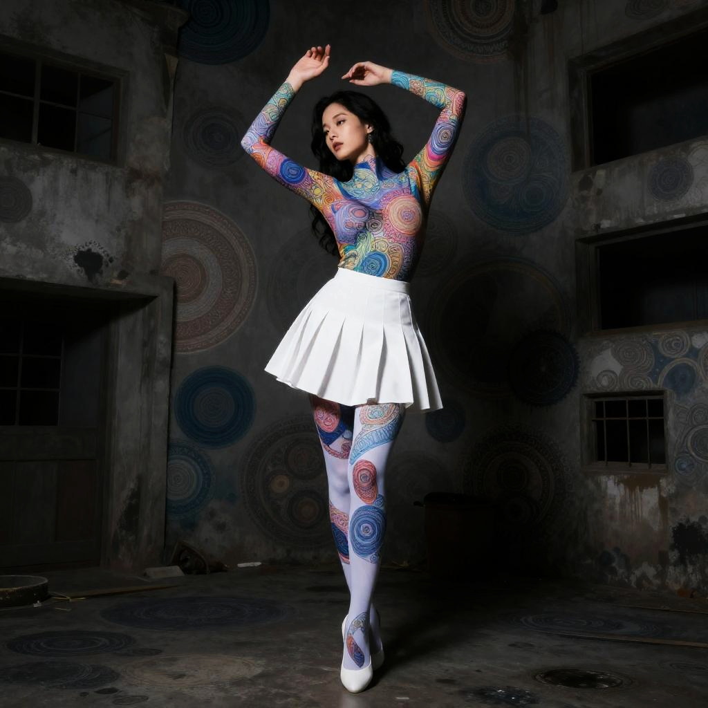 Best quality, masterpiece, ultra high res, raw photo, beautiful and aesthetic, deep shadow, dark theme, (photorealistic:1.4), 1girl, pantyhose, white pleated skirt, jacket, slim body, fit, Graceful poise, evocative atmosphere, magnetic presence, refined seduction, captivating mystique, Intricate zentangle patterns, a single female figure, astonishing level of detail, generously endowed, full-body composition, striking perspective, a chaotic masterpiece, gracefully poised, inspired by brutalist architecture, vibrant color palette, undertones