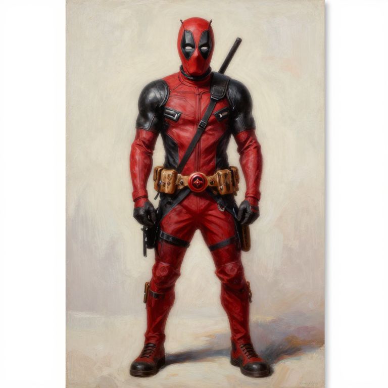 "Advertising Poster An Oil painting of Deadpool, full body, wearing hypebeast - style Balenciaga streetwear, Louis Vuitton monogram pattern on his cloths, style of Michelangelo,"