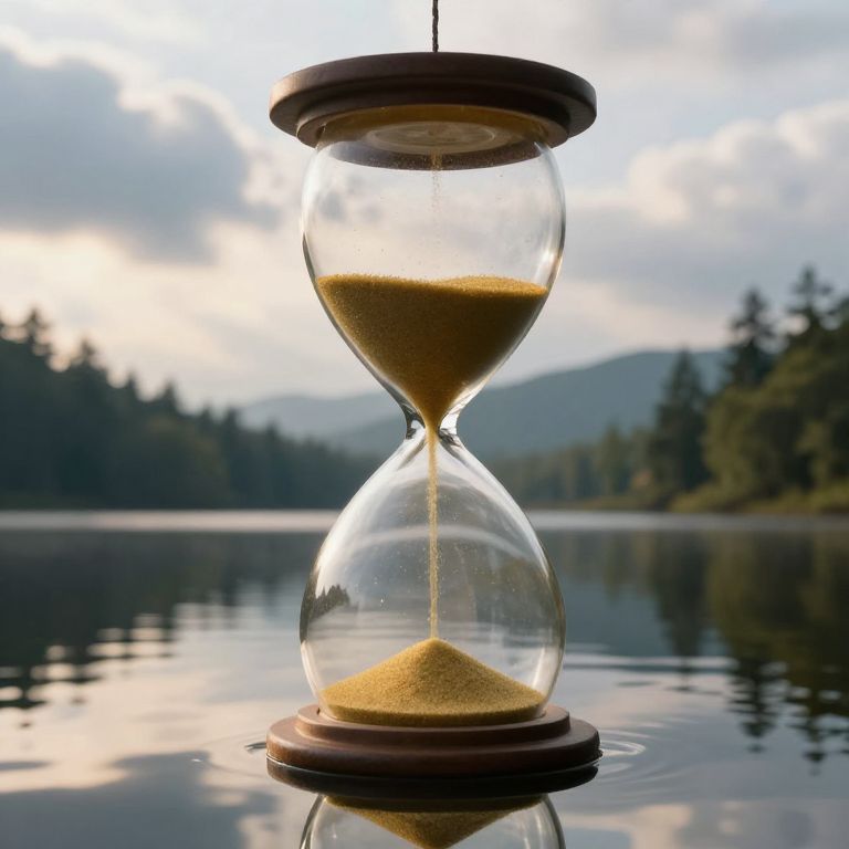 Photograph of a wooden hourglass with a clear glass body, filled with golden sand, standing in still water. The background features a tranquil lake with a reflection of trees and mountains under a partially cloudy sky. The hourglass is centered, with sunlight shining from the top, creating a soft glow. The water is calm, and the scene exudes a serene, peaceful atmosphere. The hourglass's top and bottom are dark wooden discs, contrasting with the clear glass and golden sand.