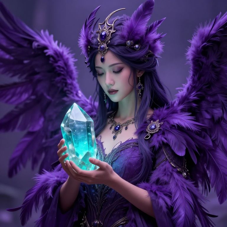 Incomparable earth goddess nurturing 4k fantasty detailed, purple feathers, holding turquoise crystal,