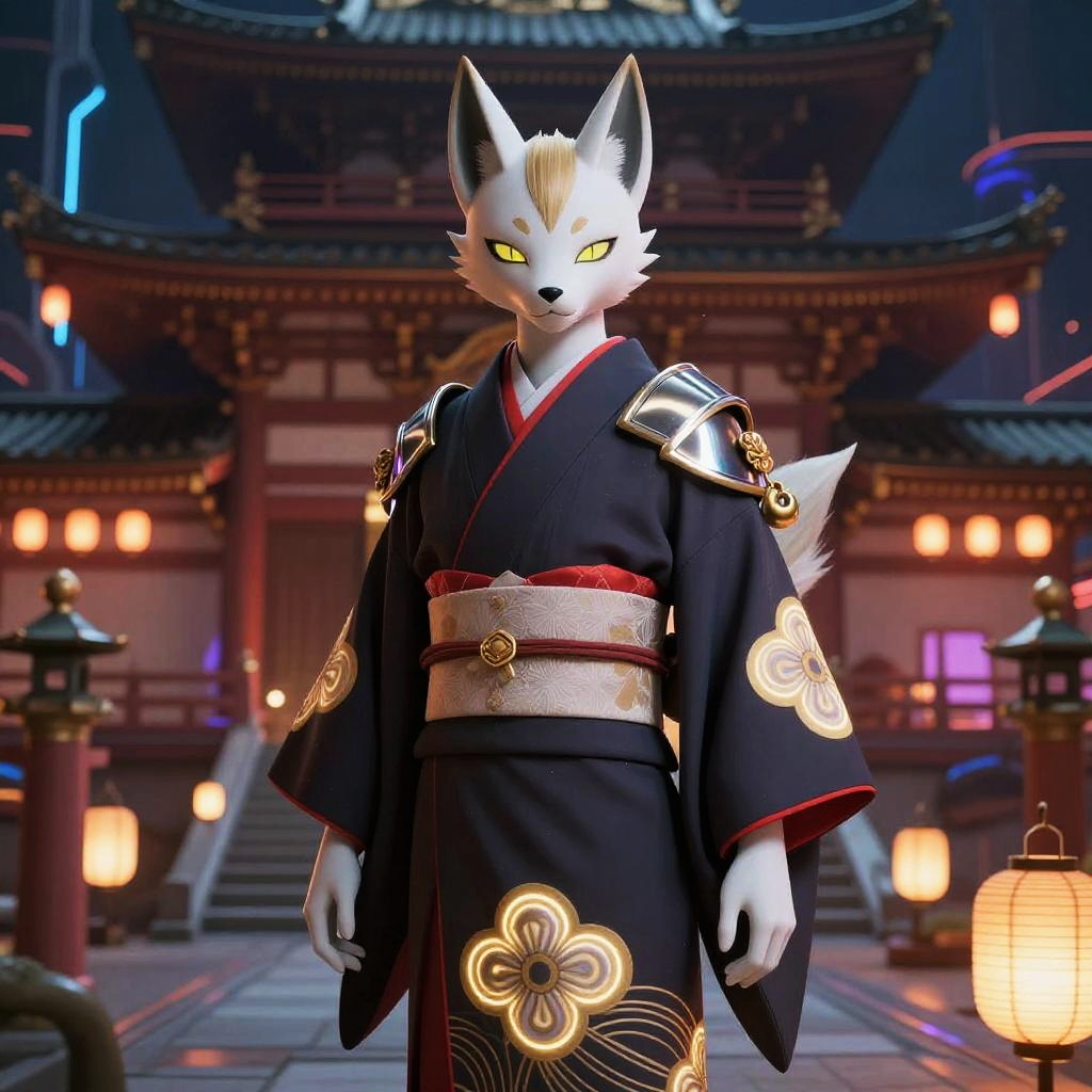 Kitsune update, humanoid kitsune character wearing a high-tech kimono with glowing patterns, amidst a futuristic temple setting with floating lanterns and neon accents, atmospheric and detailed