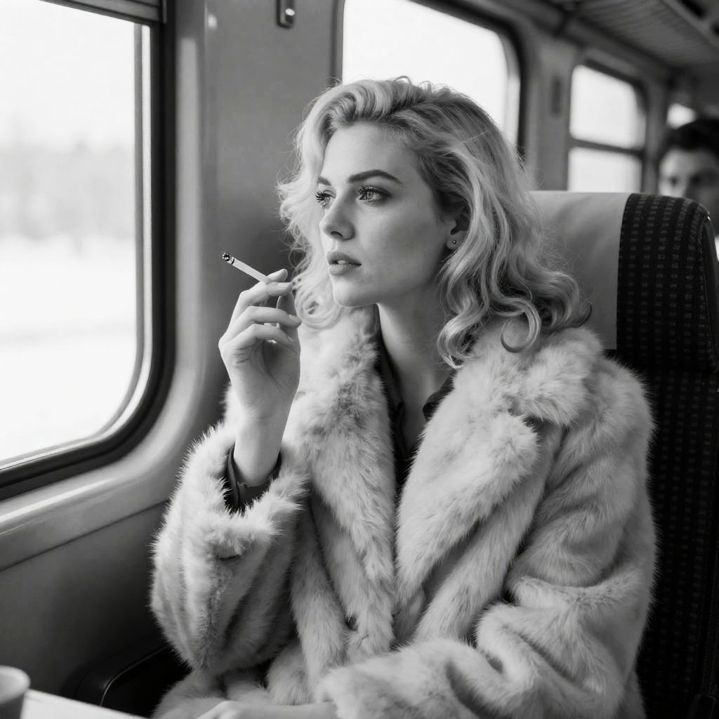 Black and white photograph of a blonde woman with wavy hair, wearing a fur coat, holding a cigarette to her lips. She sits in a train compartment, looking to the left with a serious expression. Striped seat, curtained window in the background. Second person's face partially visible behind her.