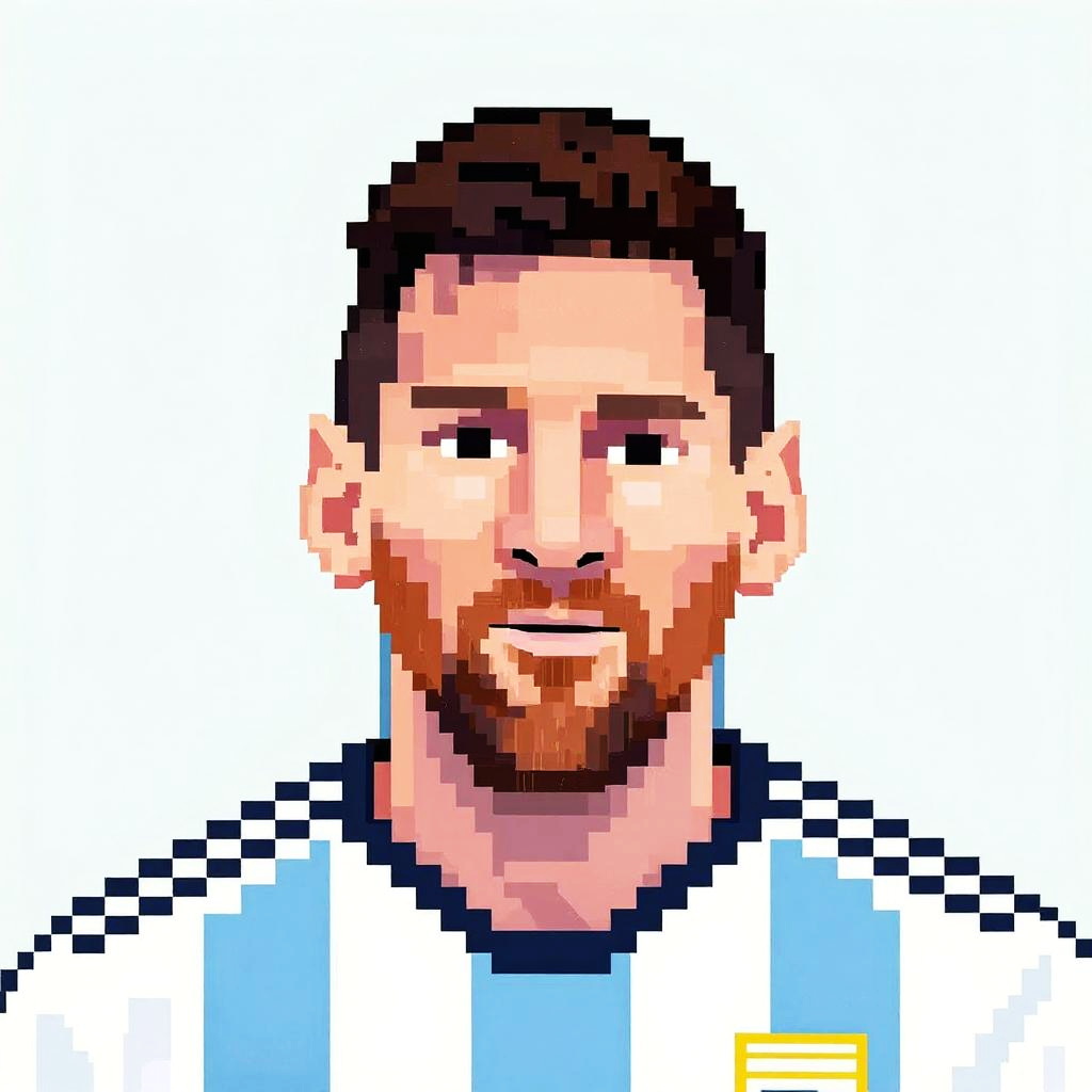 Messi pixel art easy, close-up pixel portrait capturing his determined eyes, pixel clusters defining contours, simplified jersey details with iconic number, soft pixel shading, against a vibrant pixelated stadium atmosphere.