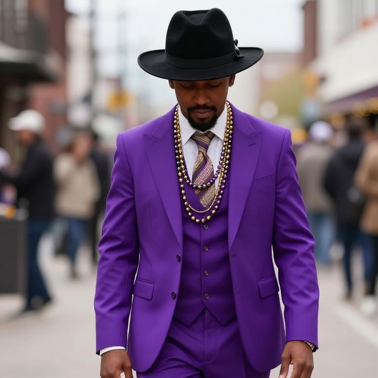 "Stylish Mardi Gras Outfit, dressed in a purple suit and a black hat"