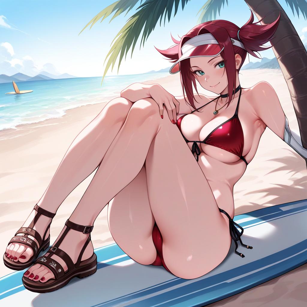 Illustration of an anime-style young woman with red hair and turquoise eyes, wearing a shiny red bikini and a sporty visor, sitting on a surfboard under a palm tree on a sunny beach. The background shows a calm ocean with mountains in the distance and a clear blue sky.