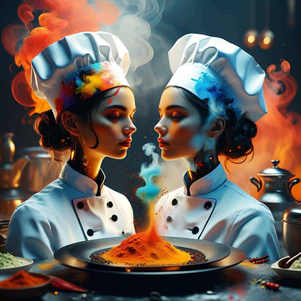 3D head shot intricate portrait of the beautiful two chef female face silhouettes mixed with liquid acrylic paint and smoke, elegant, abstract art, surrounded by gourmet dishes, spices, utensils, concept art, epic, octane render, composition by Kandinsky