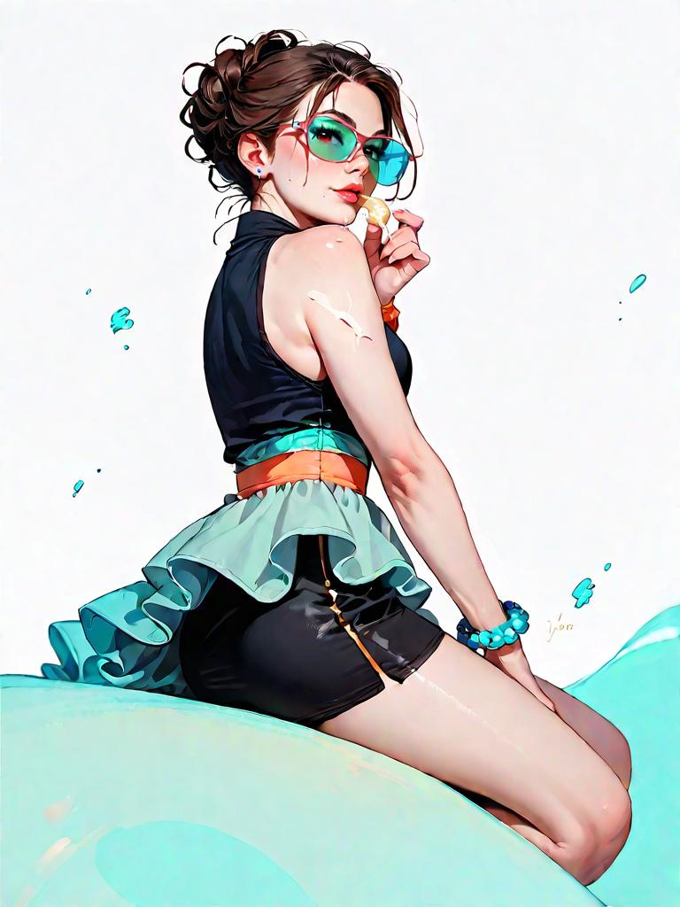 1girl, source_comics, realistic face, full body shot, Woman, bohemian, sleeveless A-line mini dress with earth-toned paisley and ethnic prints, scoop neckline, flowy silhouette, lightweight fabric, shades of brown, cream, and rust, turquoise beaded bracelet, oversized sunglasses with tinted lenses.