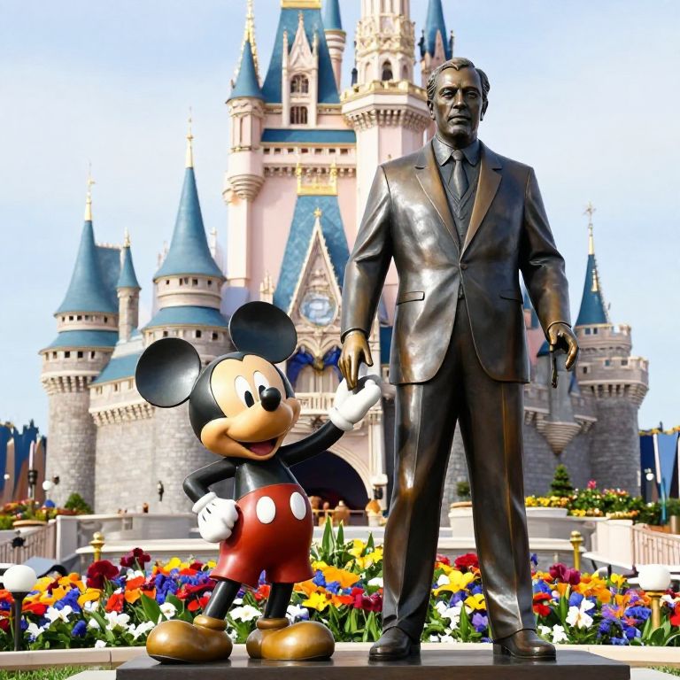 Photograph of a bronze statue of Walt Disney in a suit standing beside Mickey Mouse, with a colorful Disney castle and flower garden in the background.