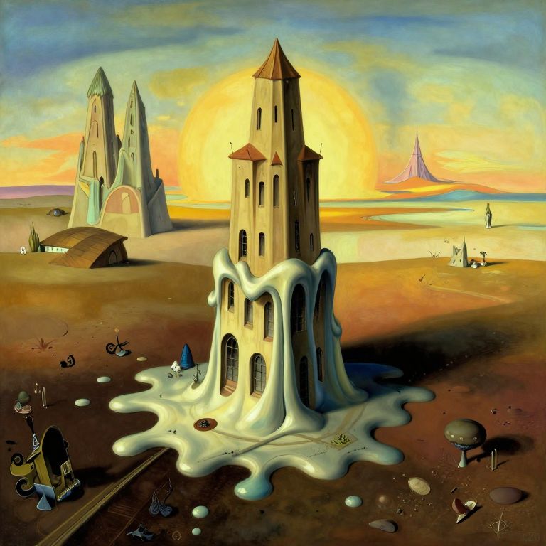 Craft an image depicting a surreal landscape with a melting tower at its center, reminiscent of Salvador Dalí's surrealist masterpieces. This dreamlike scene should be viewed from a bird's-eye perspective, revealing intricate details and whimsical elements characteristic of Dalí's artistic vision. Incorporate vivid colors, dramatic lighting, and dream-like textures to evoke wonder and intrigue in this thought-provoking visual narrative.