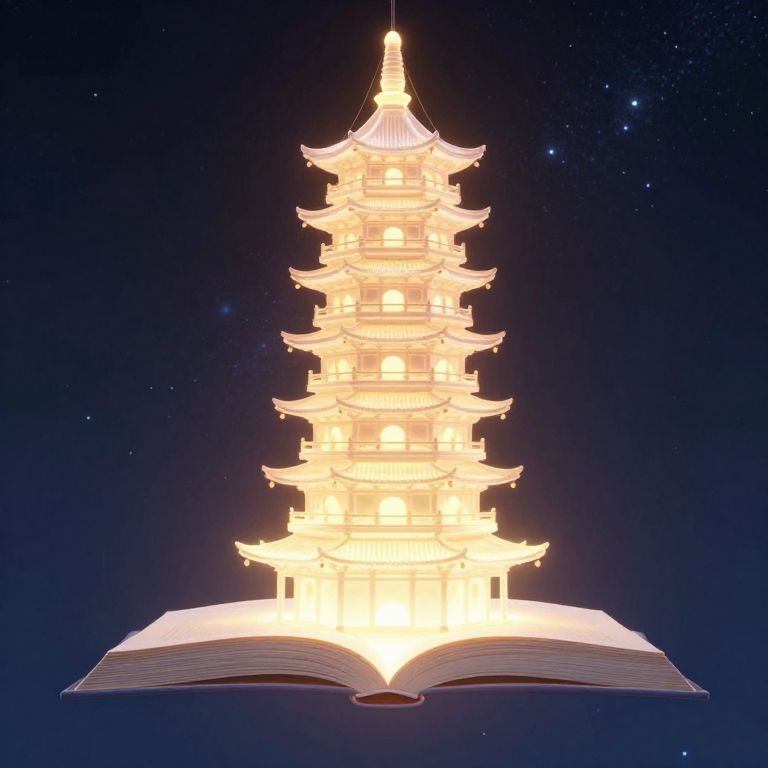 A mesmerizing 3D-rendered scene depicts a glowing, translucent pagoda-like structure suspended upside-down against a starry night sky, its illuminated tiers casting a warm, ethereal glow that seems to emanate from an open book at its base, evoking a sense of magical storytelling and wonder.