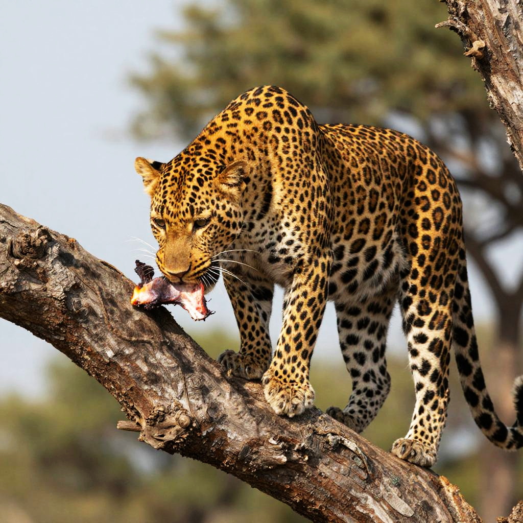 Photograph of a leopard perched on a thick, gnarled tree branch. The leopard's golden coat with dark rosette spots stands out against the sunlit bark. Its head is lowered, focused on a small, partially eaten piece of prey in its mouth. The background is blurred green foliage and a bright sky, adding depth to the natural scene. The leopard's powerful muscles and sharp claws are visible, highlighting its grace and strength.