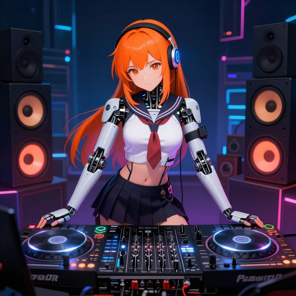 Digital illustration of a female anime-style robot DJ with orange hair wearing a futuristic school uniform. She is leaning on a DJ console surrounded by multiple glowing sound equipment and speakers in a cyberpunk-themed studio environment.