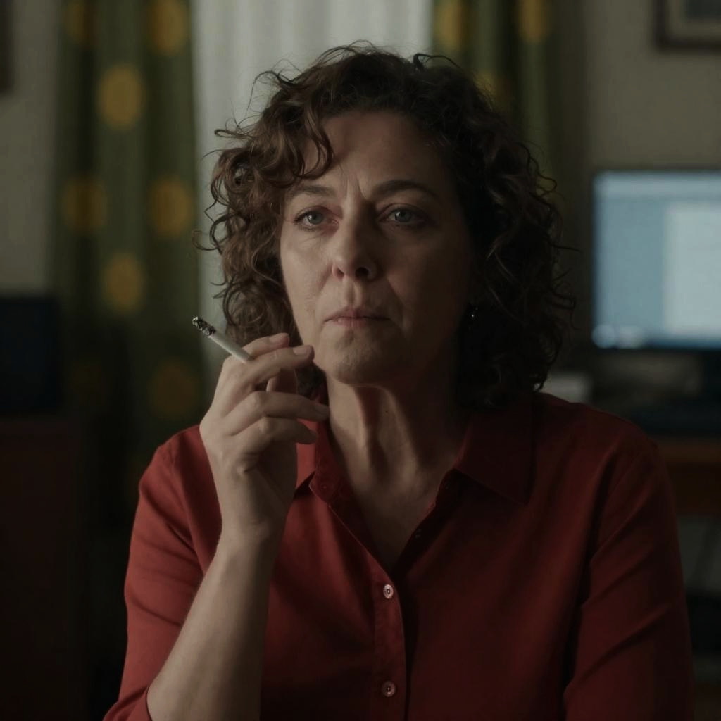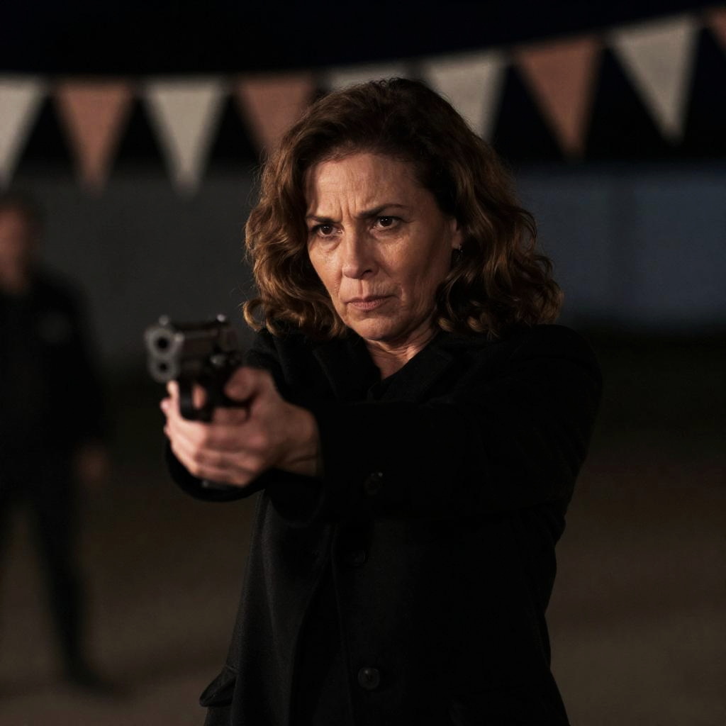 Middle-aged woman with wavy brown hair, intense expression, wearing a black coat, holding a gun with both hands, pointing forward. Background is blurred with indistinct shapes and dim lighting. Nighttime setting. Blurred bunting strings in the background.