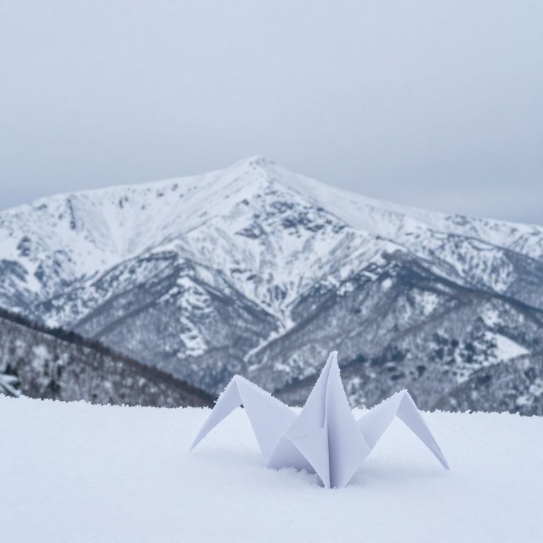 In the hushed embrace of winter, a snow-clad mountain range stands as a silent sentinel, its pristine peaks folding into origami-like forms—a symbol of eternal patience and the quiet promise of renewal, where the crisp air whispers of solitude and the earth prepares for spring's transformative embrace.