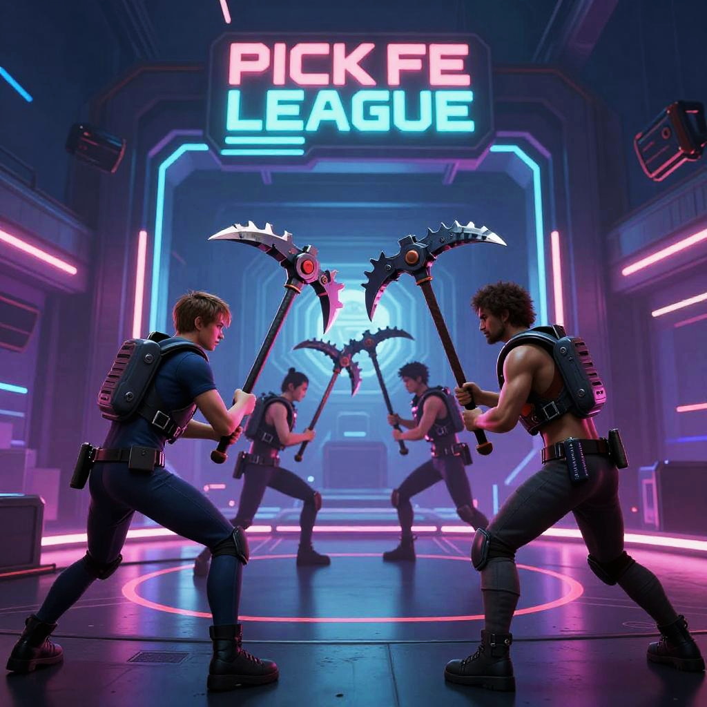 Pickaxe League intense battle scene, futuristic arena with glowing neon lights, players wielding high-tech pickaxes, dynamic action, vivid colors, cyberpunk style
